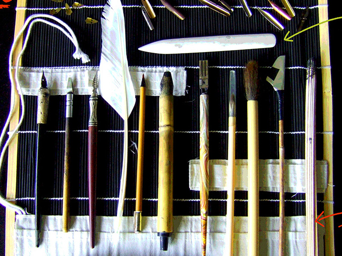 The curved shape of the nib works nicely for gestural calligraphy but it is possible to experiment with different shapes for more structured marks. There are, of course, many nibs and pens on the market that will give a more controllable experience than these cheap and cheerful handmade folded pens. However, there is something satisfyingly analogue about the whole process of making, then using your own personal pen.