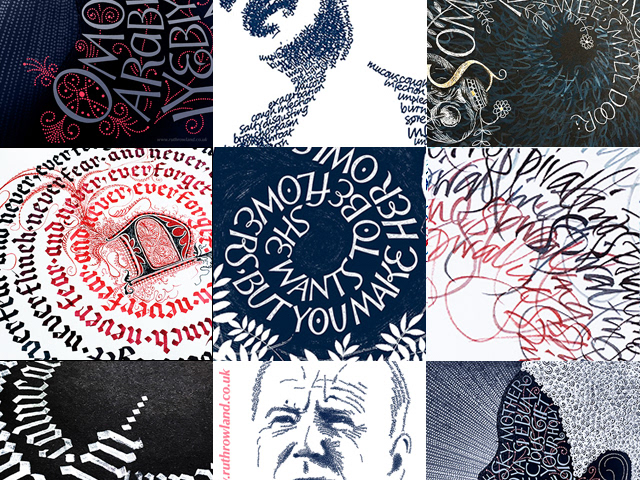 • Welcome to my illustration folder. Words weave their way through my work, along with intricate pen and ink and decorative patterns. I enjoy creating calligrams ranging from simple shapes to more complex portraits • A fascination with history, myths, legends, folklore and tales from different cultures often inspires my illustration • If you'd like to discuss a project, please get in touch using the contact details on my About page.