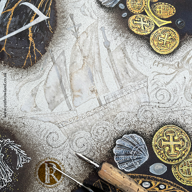 Traveling unknown seas with my pen and ink, it's a good day in the studio when I have a phantom galleon sailing across my desktop, joined by a giant octopus with letter M envy...