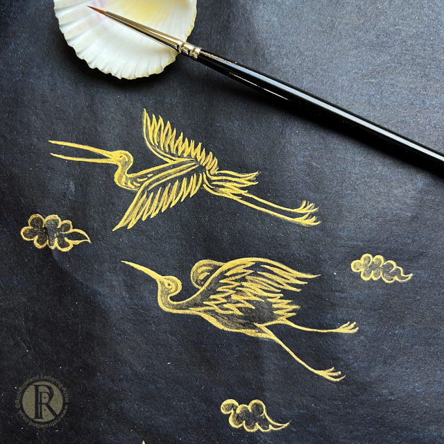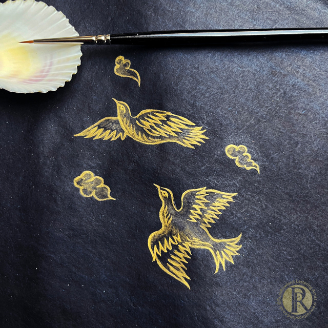 Once the painting is finished the gold can also be burnished with a small agate stone or burnisher to bring up its lustre. As the shell gold is applied much like watercolour, it would be hard to get the high shine of burnished gold leaf but I found the heavier layers of gold did polish up to a lovely reflective shimmer.